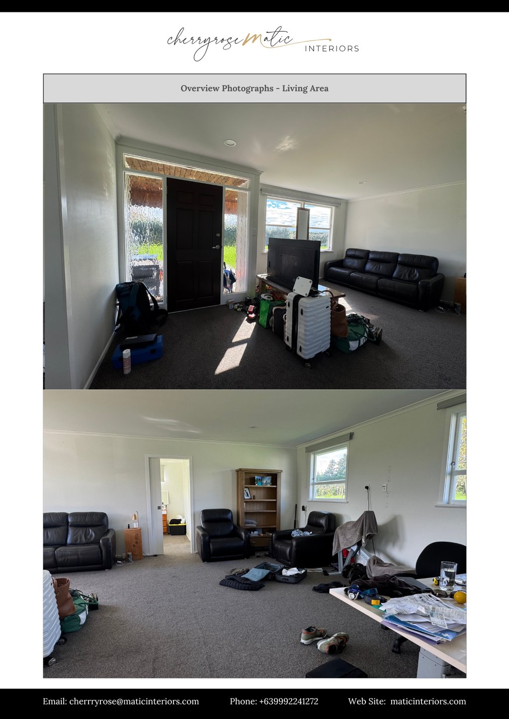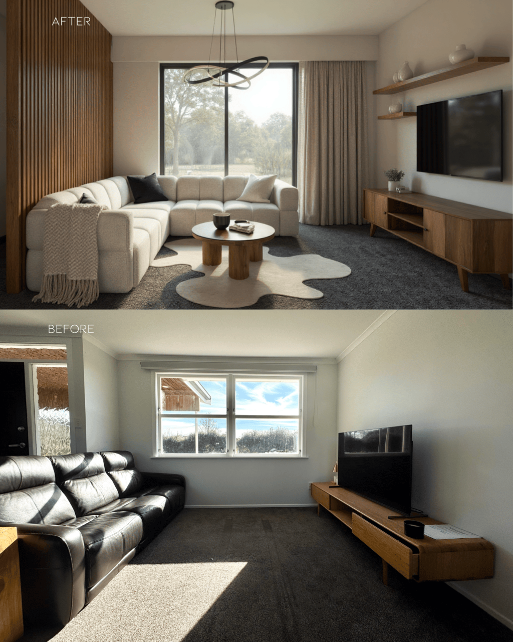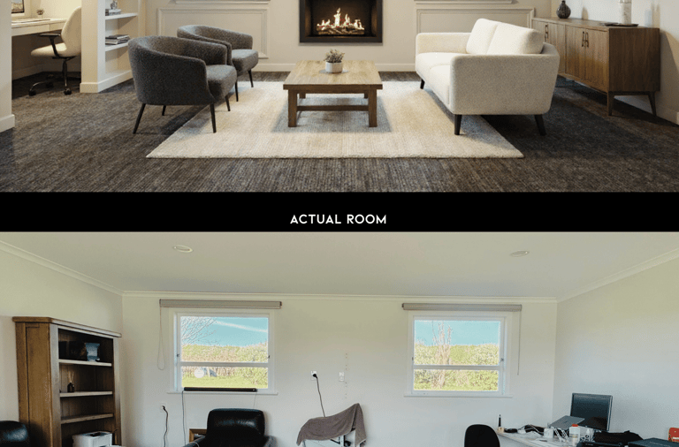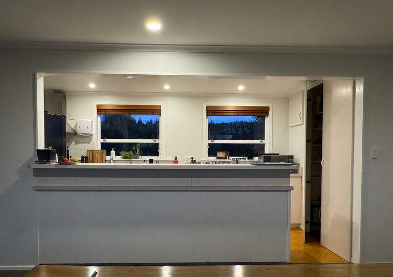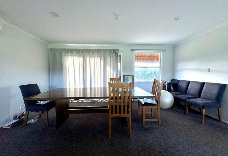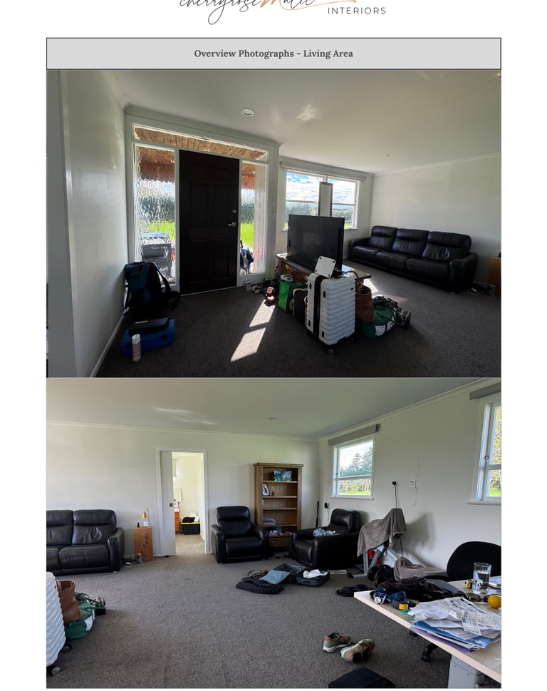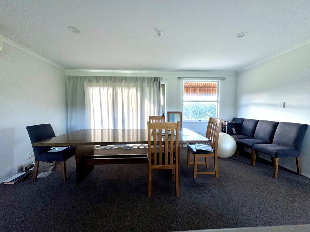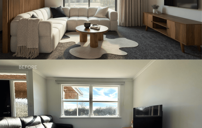 The homeowner and his girlfriend live and work on the property, so their home needs to support both relaxation and daily admin work for the kiwi orchard. Right now, the layout doesn’t work well—the square-shaped living room feels awkward, and the first thing you see when entering is a blank wall with two small windows. Large reclining sofas and a rowing machine make the space feel crowded and cluttered.