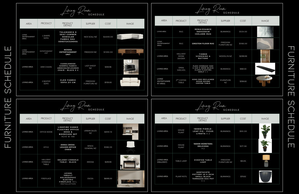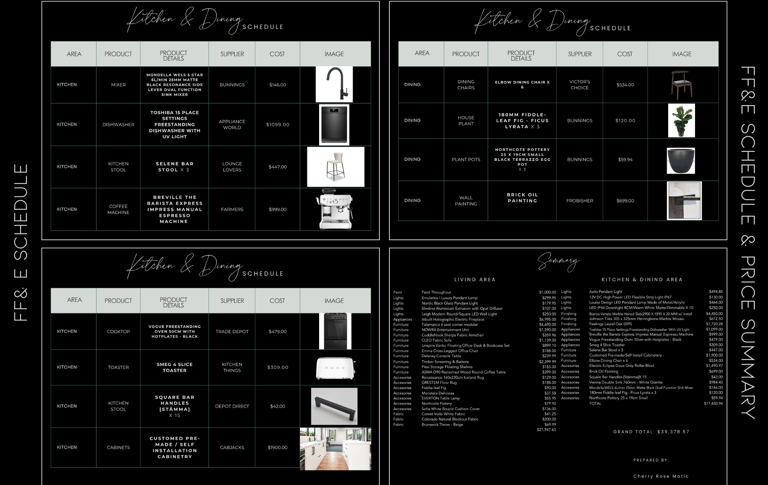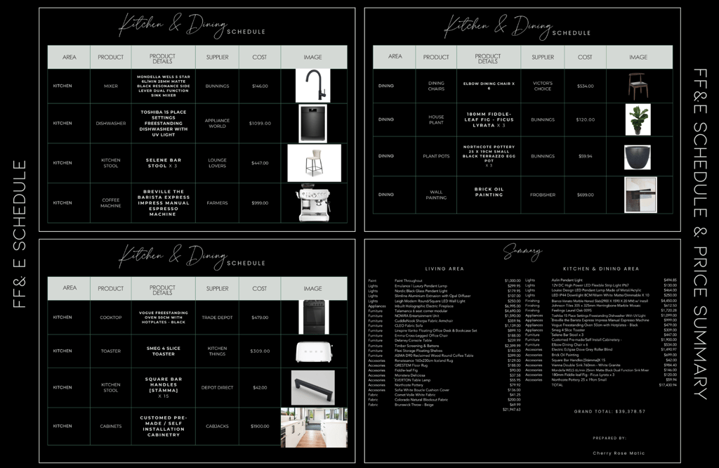 A comprehensive breakdown of Furniture, Fixtures, and Equipment, as well as Lighting selections, including: