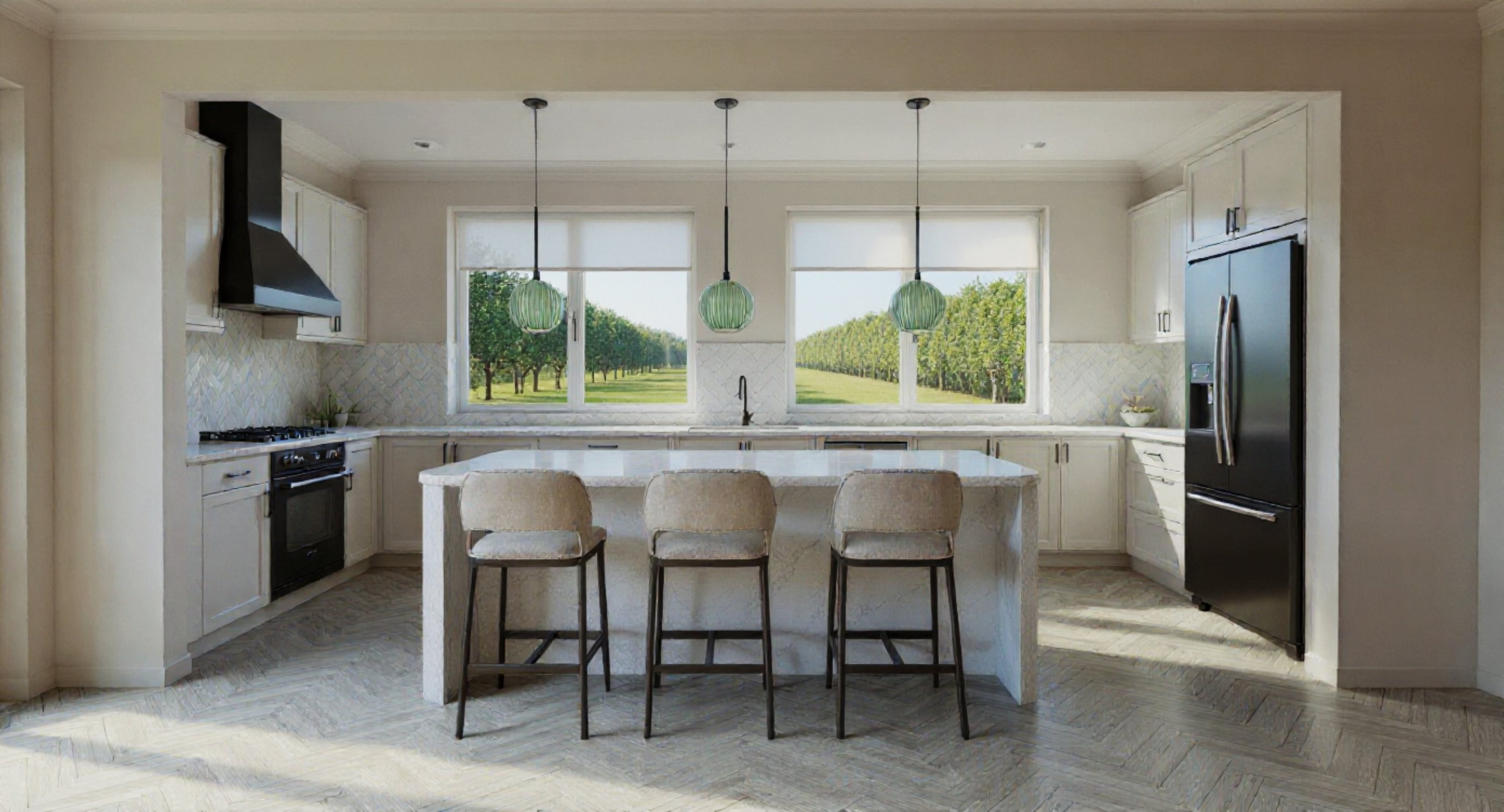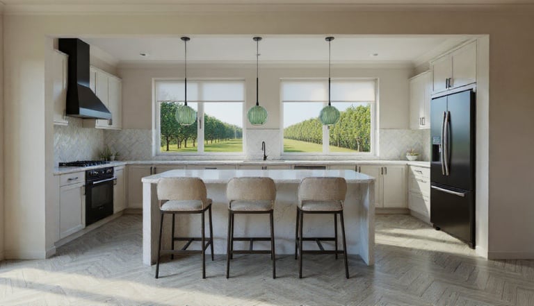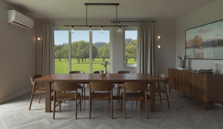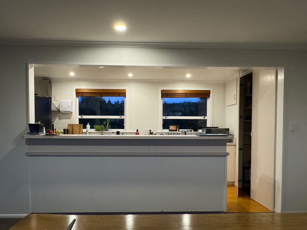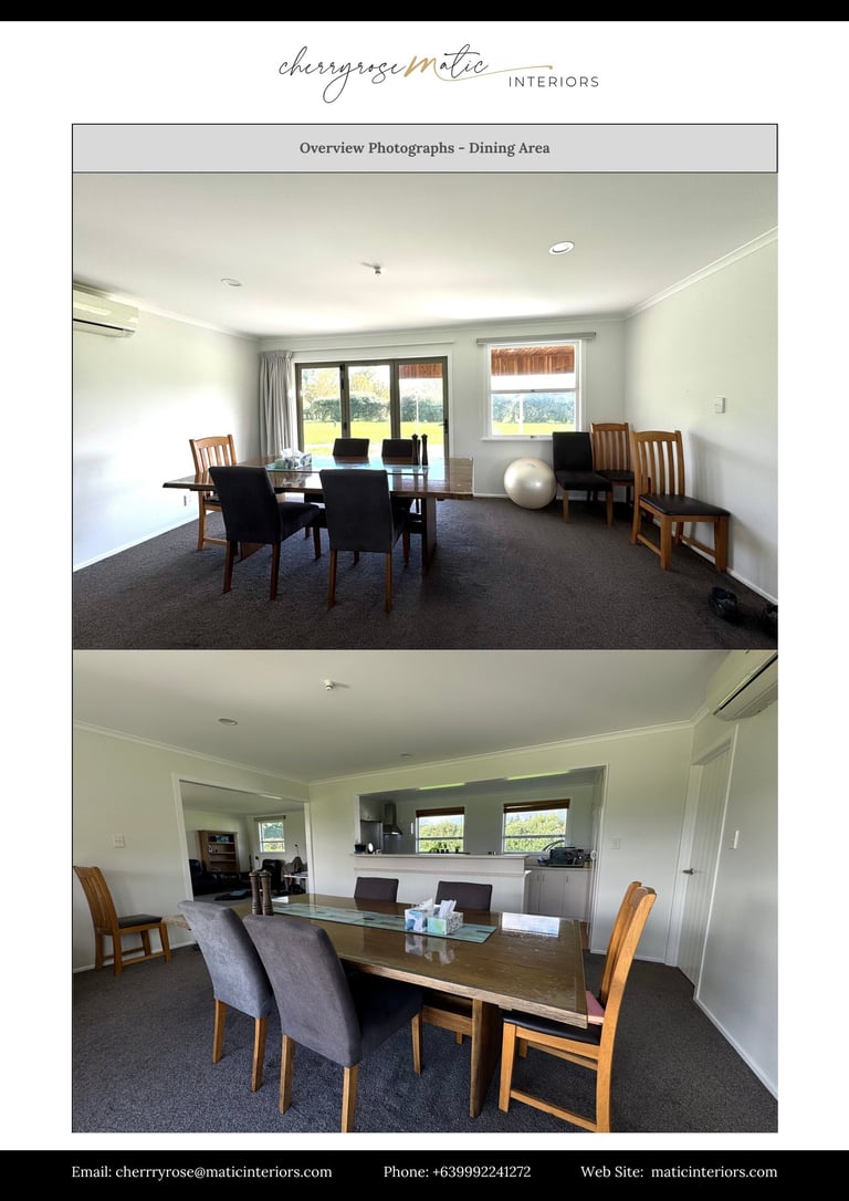 Throughout the home, lighting will be layered to soften the current clinical feel. Outdated blinds will be replaced, and dining chairs will be swapped to better match the existing acacia table. The wall color will be refreshed with neutral tones while keeping the ceiling as-is to save costs. Styling touches like plants, textiles, and décor will be layered in to give the space warmth, personality, and a calm, modern vibe.