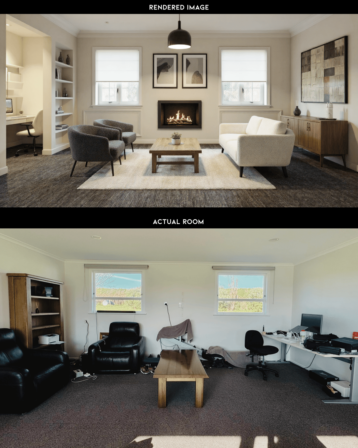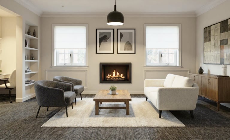 The living room will be reconfigured with an L-shaped sofa, a defined office nook, and a tea/coffee area. An electric fireplace will be placed and will become the central feature of the space. Clutter will be reduced through built-in storage and a timber slat divider will be added for privacy at the entrance.
